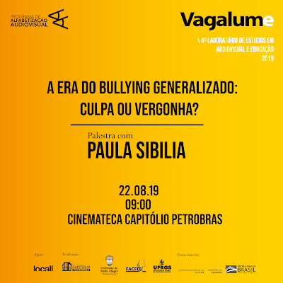 O Vagalume – Laboratório de Estudos em Audiovisual e Educação tem o objetivo de ser um espaço de reflexão, experimentação e trocas de experiências sobre o audiovisual e a educação entre professoras e professores da rede pública de ensino. Chegando à 4ª Edição em 2019, busca oportunizar o encontro que favoreça a reflexão e se firmar como espaço de formação docente articulado com o fazer cotidiano da sala de aula. Para o segundo módulo, dia 22 de agosto, a professora e pesquisadora Paula Sibilia vem a Porto Alegre discutir a era do bullying, o papel das redes sociais e suas implicações na escola.